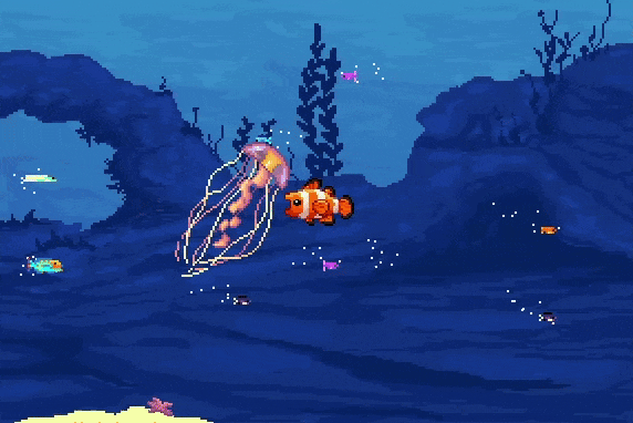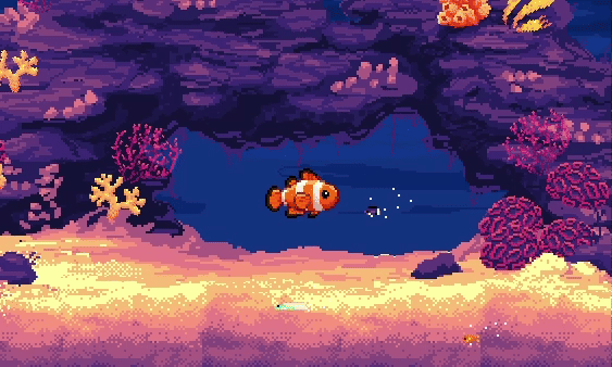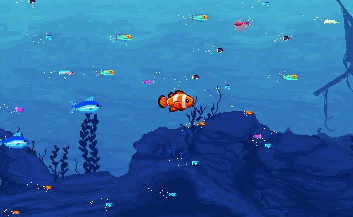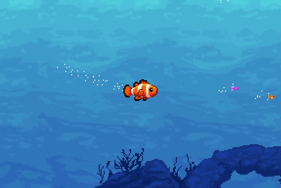 The tale of a particularly ravenous clownfish, experienced through a masterfully pixeled underwater simulation.